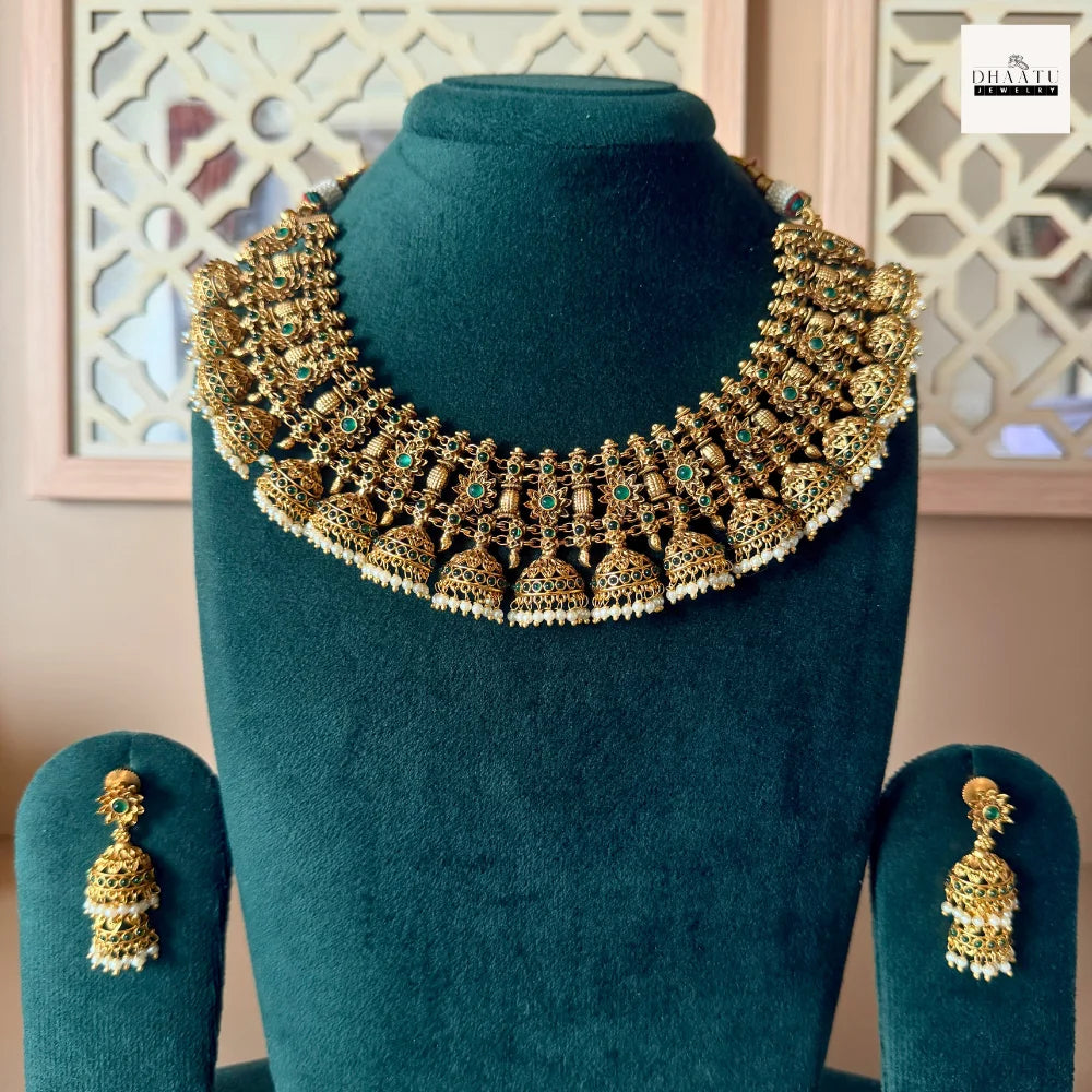 Antique Gold-Plated Jhumka Choker Necklace Set with Emerald Green Accents and Pearl Droplets