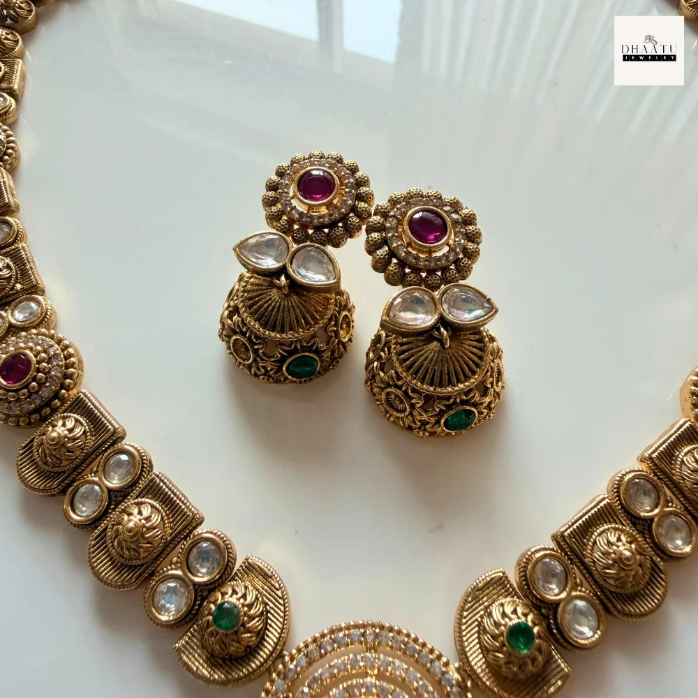 The necklace chain features alternating circular and semi-circular links, each embossed with traditional patterns and studded with multi-colored stones to ensure a cohesive, regal look. Completing the set are the matching Jhumka earrings, which mirror the pendant's floral design and feature delicate filigree work, making them a statement piece in their own right.