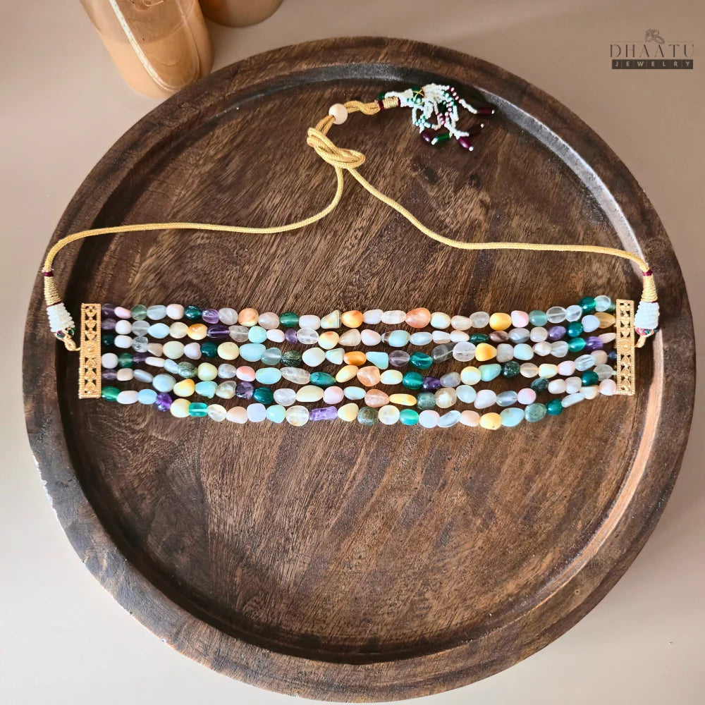 This Dhaatu choker necklace features multiple strands of delicate, oval beads made from a variety of real natural stones in beautiful mixed colors. This unique piece creates a vibrant and earthy look, perfect for adding a touch of natural charm to everyday wear or a colorful accent to casual occasions.