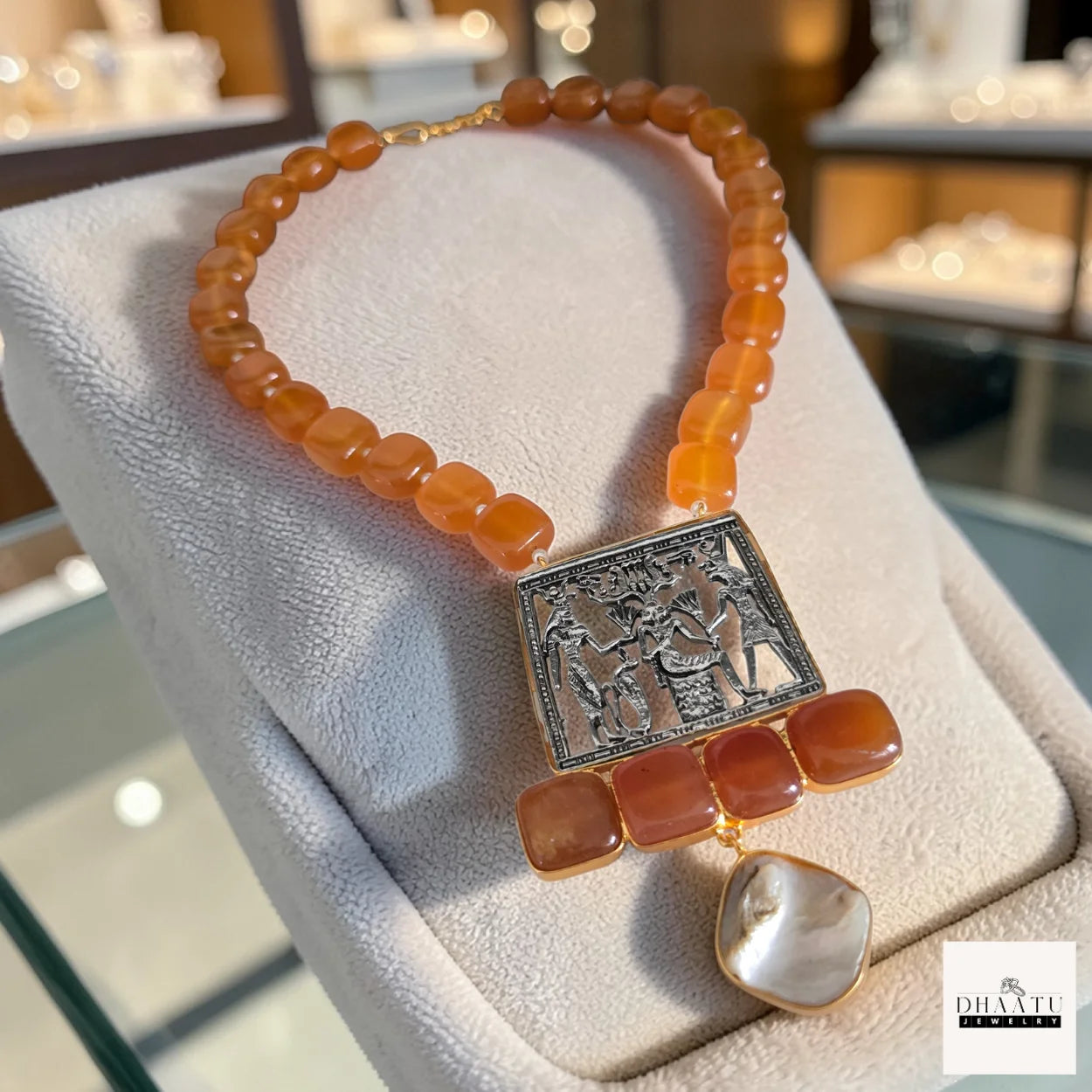 Below the main pendant, four square-cut, polished gemstone accents—matching either the Carnelian or Lapis Lazuli—add an extra layer of luxurious depth. Dangling gracefully from these accents is a unique, irregular-shaped Mother of Pearl (MOP) drop, shimmering with iridescent beauty, adding a touch of organic elegance to the ancient-inspired design. The necklace is strung with smooth, substantial beads, ensuring a comfortable and luxurious feel against the skin.