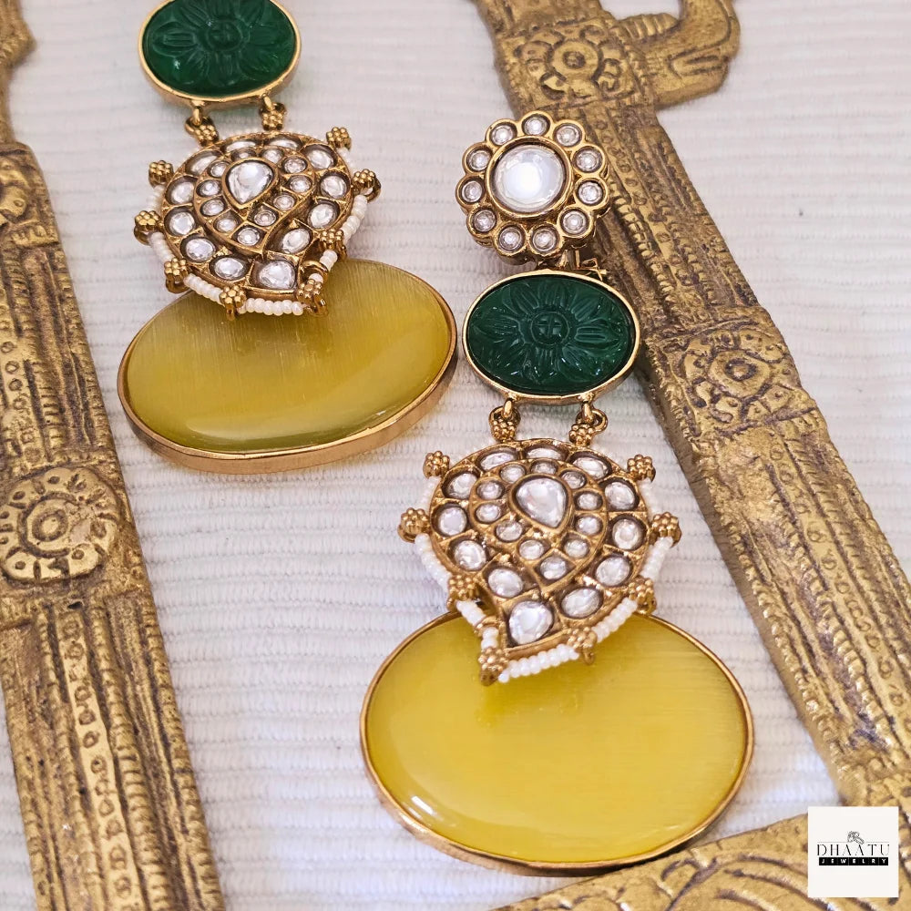 Kundan & Carved Green Stone Drop Earrings with Cat Eye Cabochon (Available in Grey & Yellow)