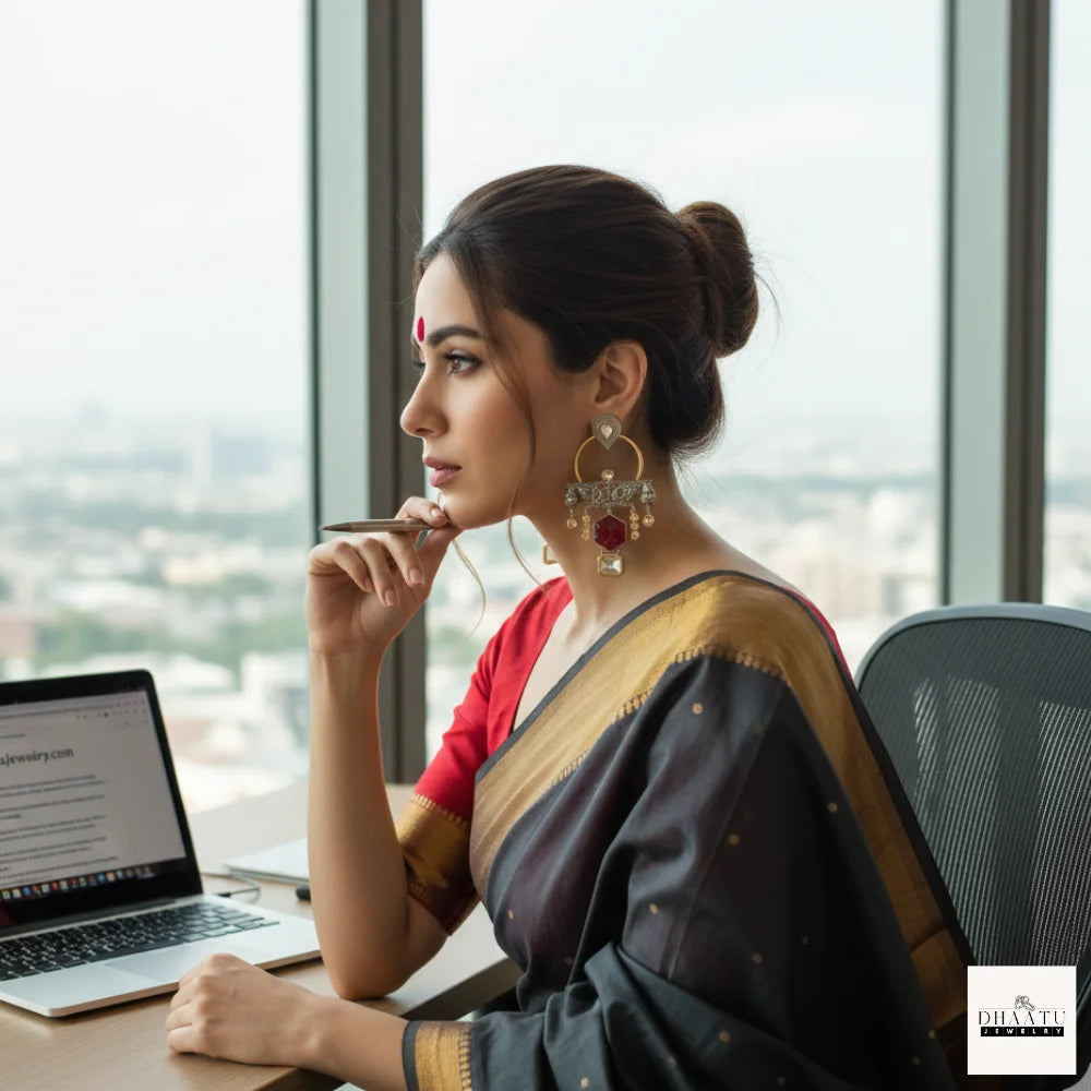 These statement earrings are perfect for special occasions such as weddings (for guests or bridesmaids), festive celebrations like Diwali and Eid, or formal evening parties. These earrings may also be worn as premium workwear. They pair flawlessly with traditional Indian attire like heavy sarees, embroidered lehengas, or ornate Anarkali suits. For a modern fusion look, try styling them with an Indo-Western gown or a structured velvet jacket and trousers. They are designed to be the focal point of your ensemble.
