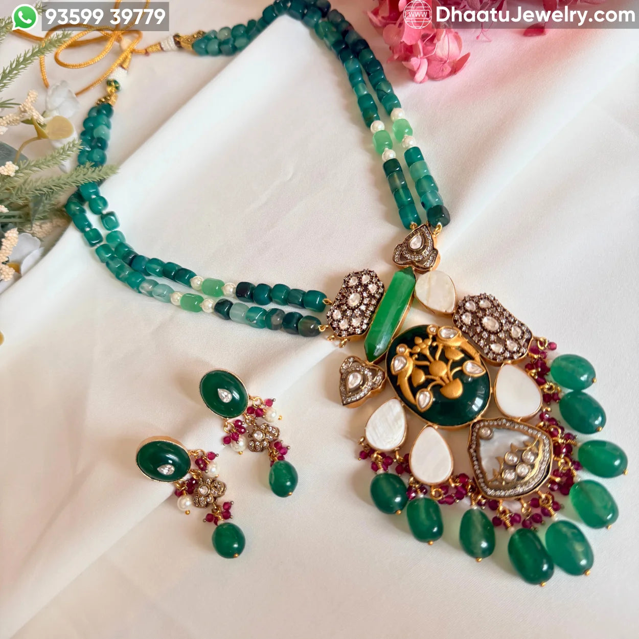 The focal point is an avant-garde pendant that blends traditional motifs with geometric precision. A striking, translucent Green Fluorite wand is set diagonally, leading the eye to a central forest-green Meenakari medallion. The piece is brilliantly illuminated by Moissanite stones, which provide a diamond-like fire and brilliance that standard crystals cannot match. Polished Mother of Pearl segments and hand-painted golden "Tree of Life" details add layers of texture and storytelling. The set is completed with matching Jade drop earrings, accented with vibrant ruby-red beads for a sophisticated color contrast.