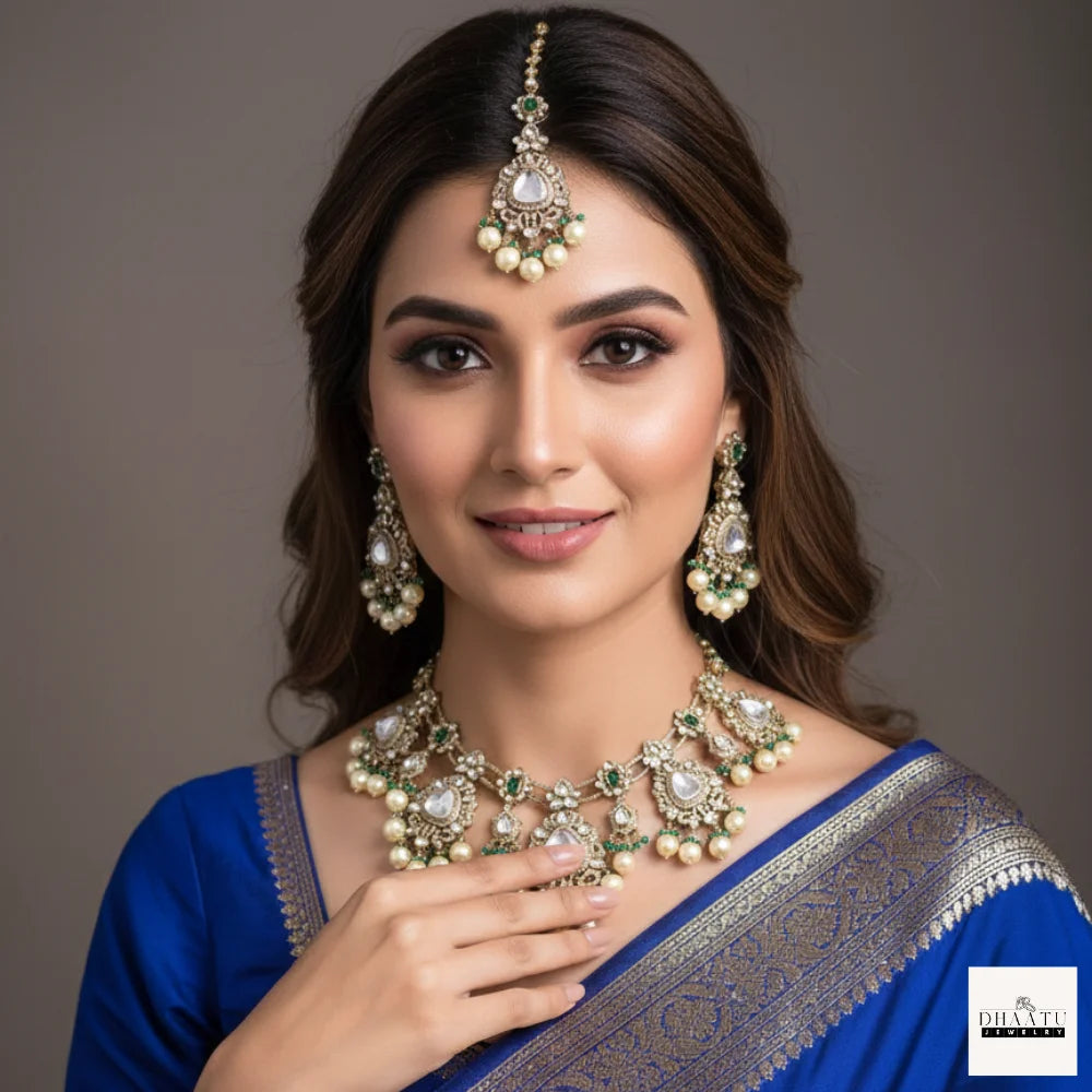 Attire Suggestions: To allow the jewelry to take center stage, pair this set with a heavy Kanchipuram silk saree, an ornate designer lehenga, or a floor-length Anarkali suit. We recommend opting for deep jewel-toned outfits—such as royal blue, emerald green, or classic maroon—to beautifully complement the natural gemstones and the warm glow of the Kundan work.