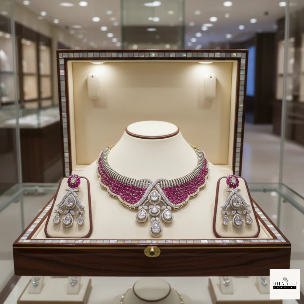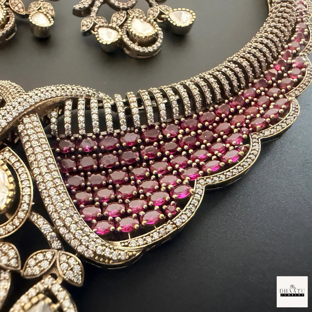 Accented with high-quality cubic zirconia stones, the design offers exceptional brilliance and clarity, closely resembling fine diamond jewelry. The gold-tone base metal enhances warmth and contrast, while the meticulously set stones add depth, symmetry, and visual balance. The matching earrings mirror the necklace’s central design, featuring ruby accents at the top and pear-shaped CZ drops that lend elegant movement and sparkle.