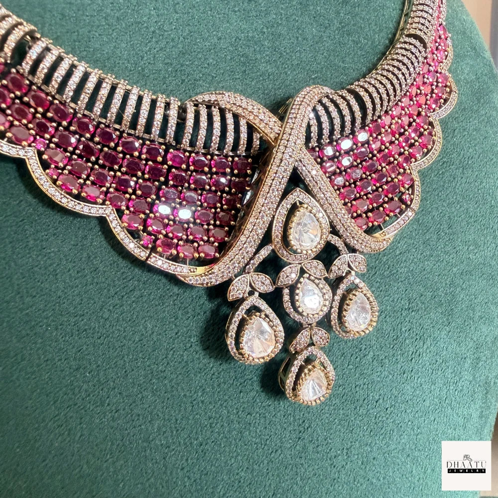 Designed to make a refined statement, this artificial jewelry necklace and earrings set showcases a luxurious blend of traditional craftsmanship and contemporary elegance. The necklace features a sculpted neckline silhouette with a graceful crossover motif at the center, highlighted by a cascading arrangement of pear-shaped drops. The surface is intricately embellished with deep ruby-tone stones arranged in dense pavé rows, creating a rich, textured appearance.