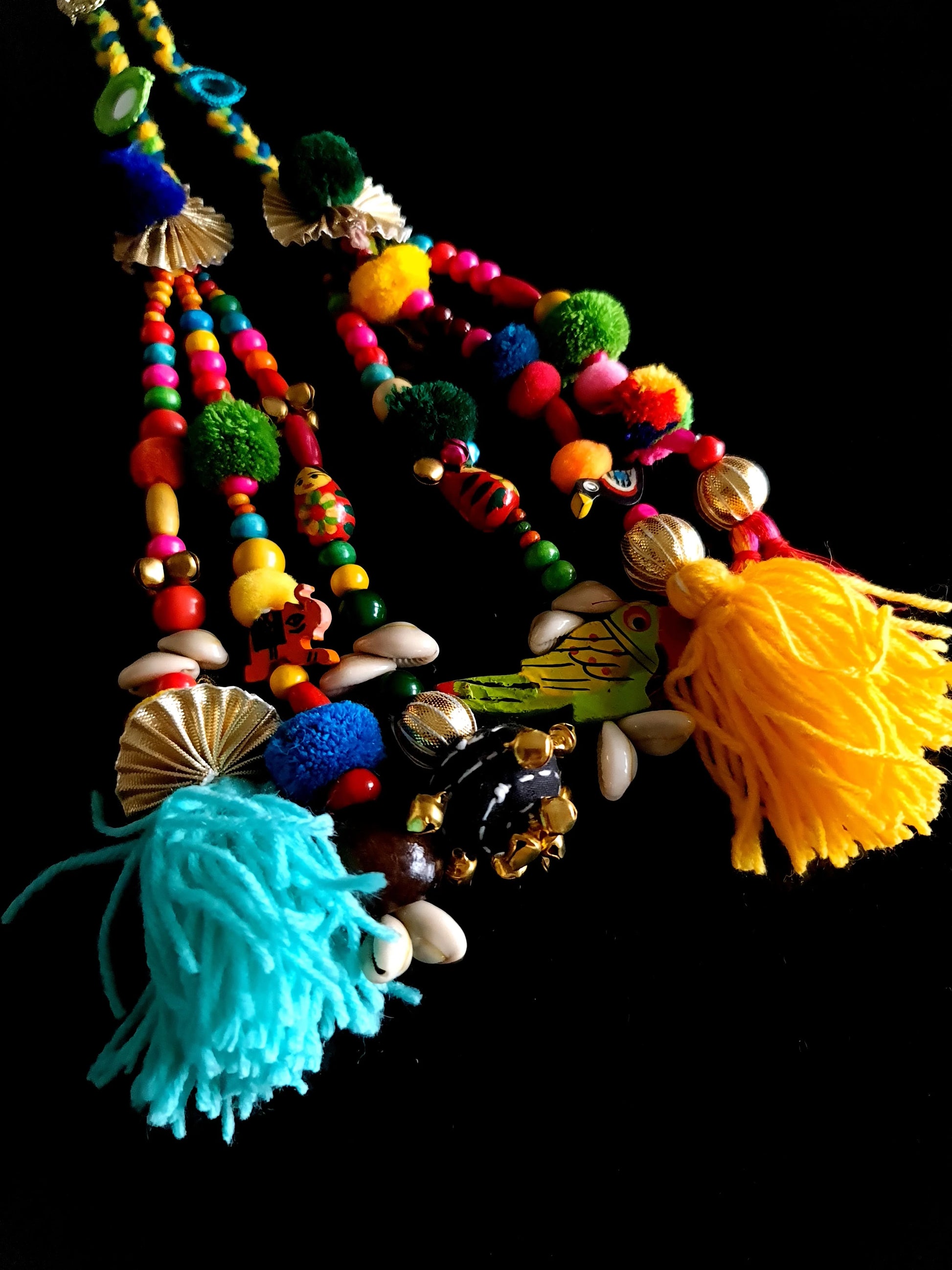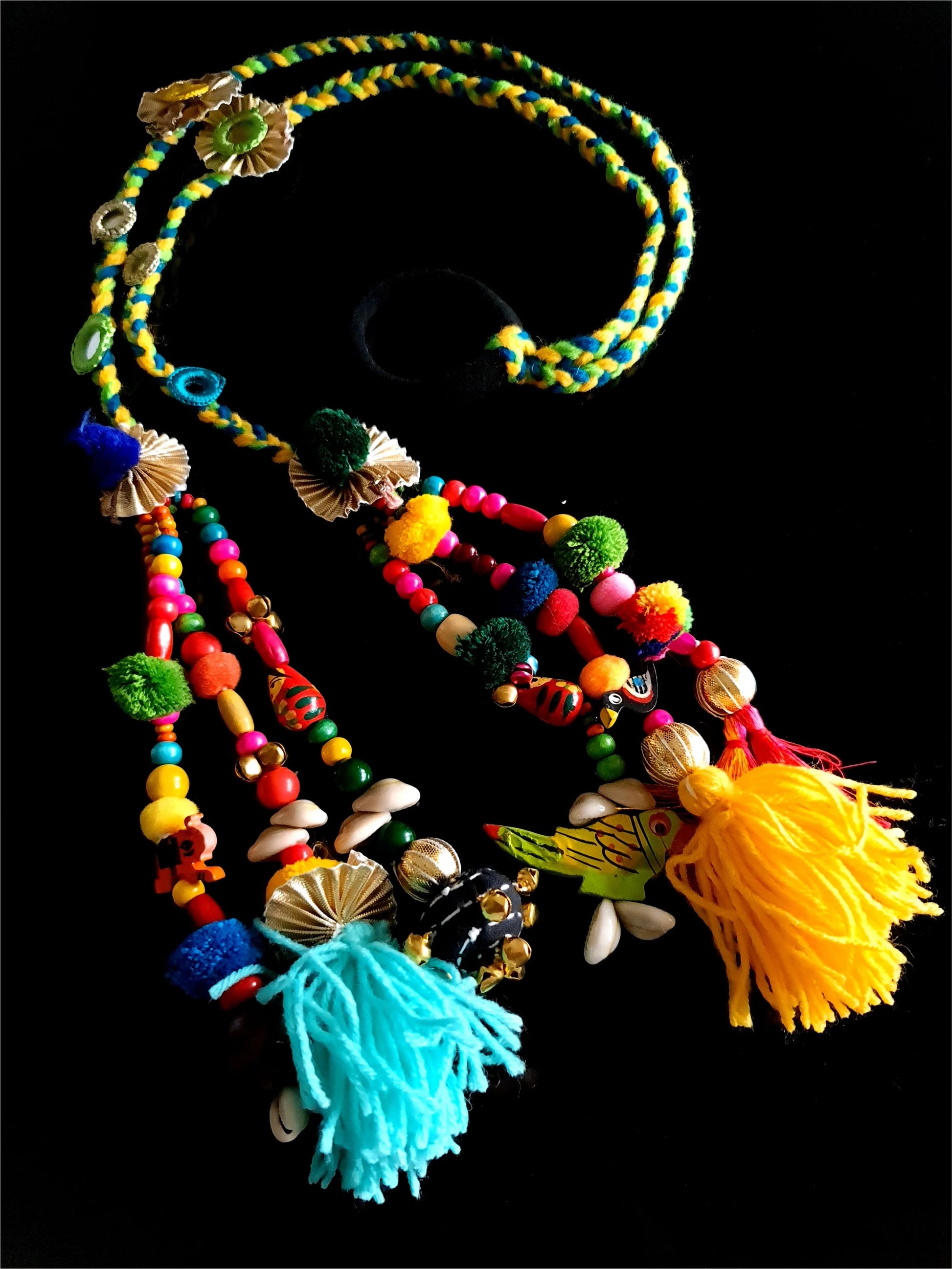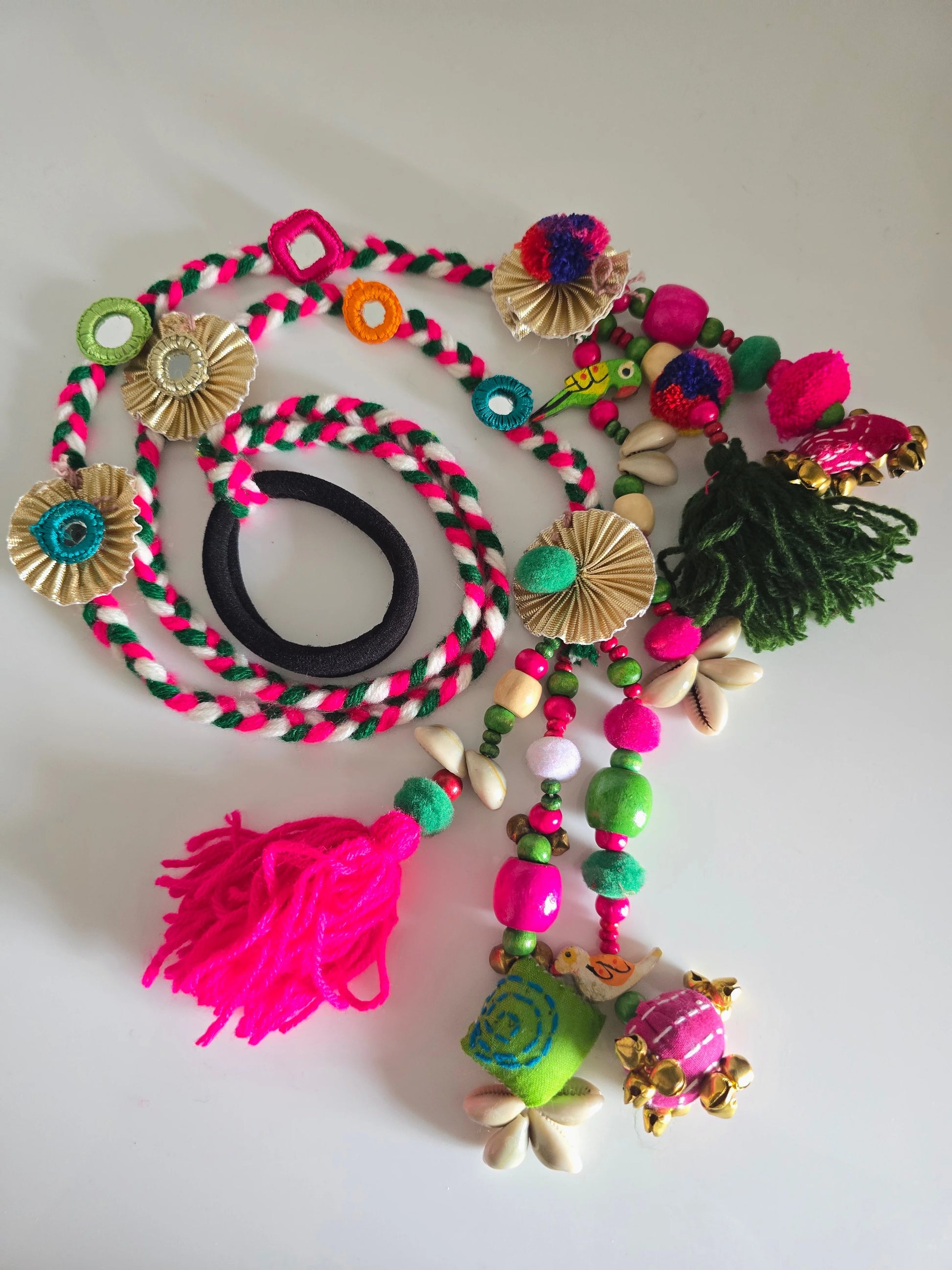 Each strand of this decorative piece is a testament to meticulous detailing. Cascading from the main braid are two embellished tassels, each a masterpiece in itself. The tassels are adorned with an array of multi-colored wooden beads, some hand-painted with charming patterns, creating a lively and artistic feel. Adding to the bohemian charm are delicate cowrie shells, strategically placed to catch the light and add a natural, earthy element. Soft, fluffy pom-poms in a variety of bright colors—fuchsia, lime green, and royal blue—provide a whimsical texture, while vibrant yellow and turquoise yarn tassels give the accessory a dynamic, flowing finish. Glimmering golden accents, including pleated metallic fans and small golden beads, introduce a touch of festive sparkle. A delightful feature of this Paranda is the inclusion of small ghungrus (bells), which create a subtle, melodious chime with every movement, adding an enchanting auditory dimension to its visual appeal. This Paranda is perfect for adding a pop of color to festive occasions like weddings, sangeets, or traditional festivals like Diwali and Baisakhi. Pair it with a traditional Punjabi suit, a flowing Anarkali, or a vibrant ghagra choli to complete a truly authentic and stylish ensemble.